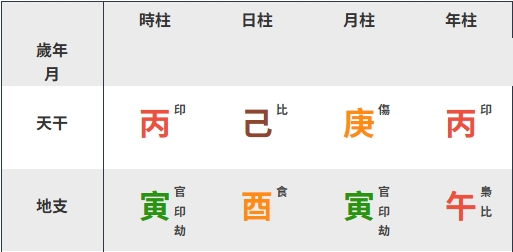 今年的八字火光熠熠,天干地支見強火。八字中無「水」也無庫(地支無土),水代表智慧與財源的滋潤,這意味著今年求財不宜過於急躁,要像水一樣順勢而為,無庫的狀態下,今年容易守不住財,故家中一定要自己造庫,平常花錢時,要多想想這是「想要」還是「需要」。天干見兩個印,雖代表多有貴人相助,但同時也會有懶散的心情產生,尤其日主自坐食神,偏好享受、享福,別忘了還是要多努力才有收穫啊。平日建議多喝水、保持規律作息,並多與長輩交流獲取經驗智慧。有餘裕的話,多參與水資源保護或公益捐贈,對運勢大有幫助。